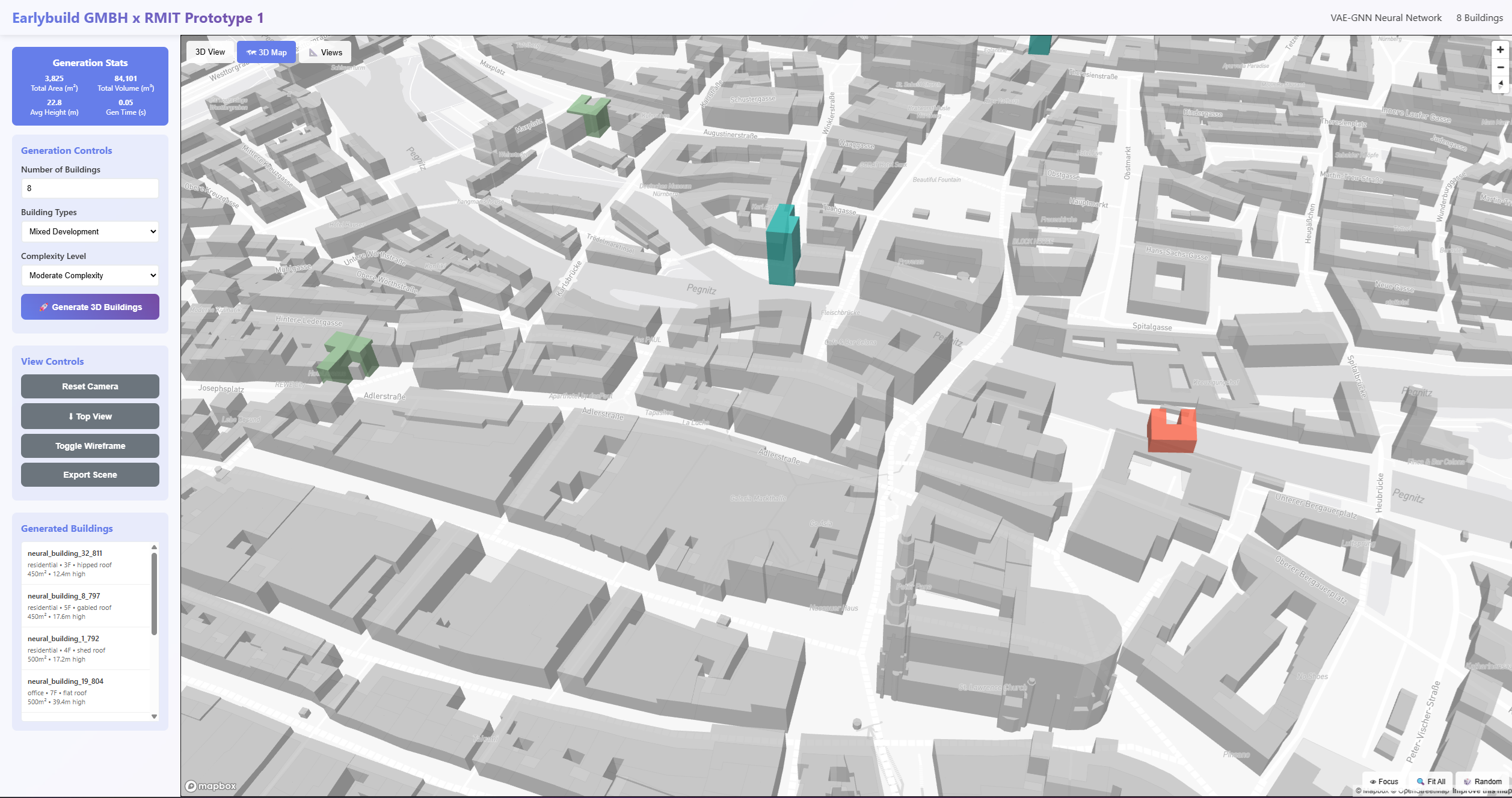 University capstone project in collaboration with EarlyBuild GmbH. Developed a VAE-GNN hybrid neural network for automated 3D building generation with 136,004 parameters trained on 1.1 million building samples. Built a Flask REST API supporting 8 building types (residential, commercial, industrial, office, retail, mixed, public) with configurable complexity levels. Implemented interactive 3D visualization using Three.js and Mapbox GL JS for real-time building generation and spatial analysis. Created Unity3D integration through Typogen formatter with 128×128 grid constraints and automated material selection. Includes comprehensive test suite with 17 test cases and complete technical documentation.