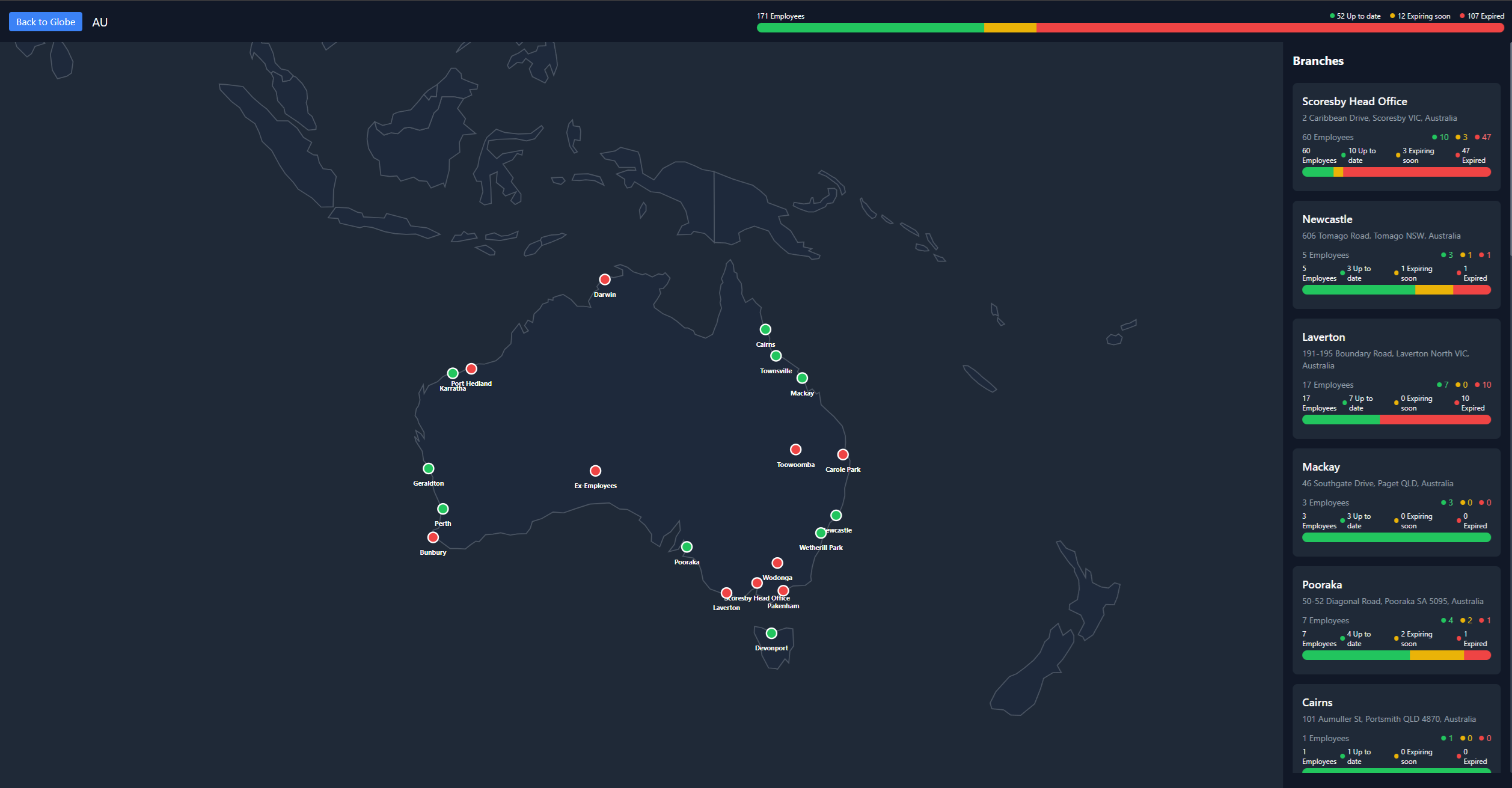 Production enterprise safety compliance platform serving 1,000+ users across 55 branches in 9 APAC countries. Built full-stack data integration architecture unifying 4 disparate enterprise systems (OnLocation LMS, CLC, Quickserve, MyHR) to manage real-time compliance tracking for 450+ high-risk electrical workers. The platform tracks 1,698 active certificates and 27,971 induction records across a database of 12,017 personnel, implementing automated NFPA-70E compliance validation and multi-country regulatory compliance logic. Delivered $200k+ annual ROI by automating a month-long manual reporting process, replacing Excel/PowerPoint workflows with real-time visibility. Selected for global expansion based on APAC success, with international operations pursuing worldwide implementation. Nominated for Global Recognition Award for exceptional contribution to operational efficiency and safety compliance automation.
